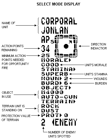 | SELECT: | If the cursor is placed over one of your units with APs remaining then you will be able to select that unit for movement and other actions. Once you select this option you will enter select mode. |