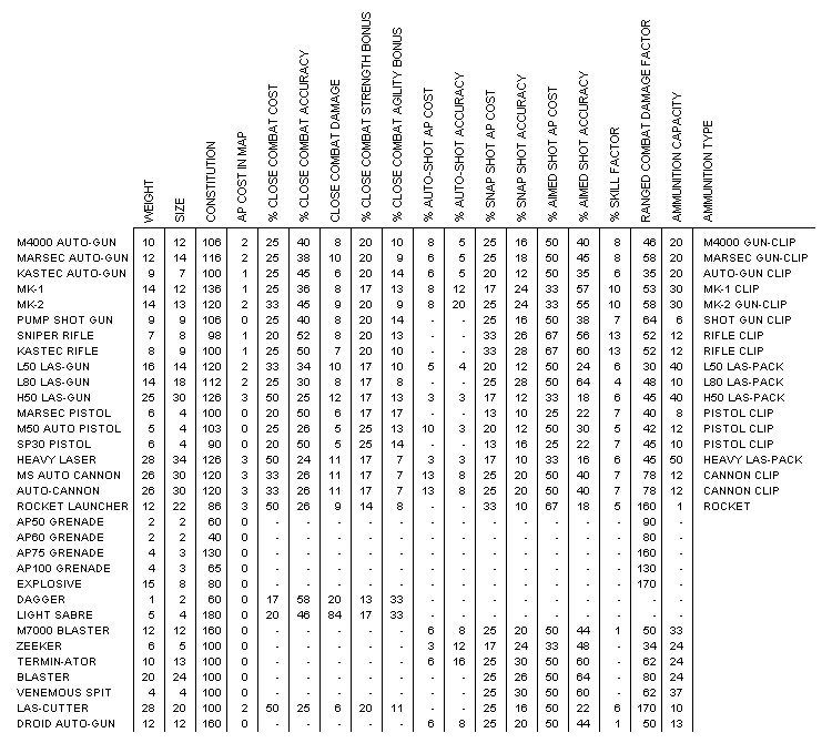 There are three basic categories of objects in Laser Squad, weapons, ammunition and other objects. There are three types of weapon, close combat weapons, ranged weapons and grenade type weapons. Most ranged weapons can be used in close combat. Objects can have some or all of the following characteristics: